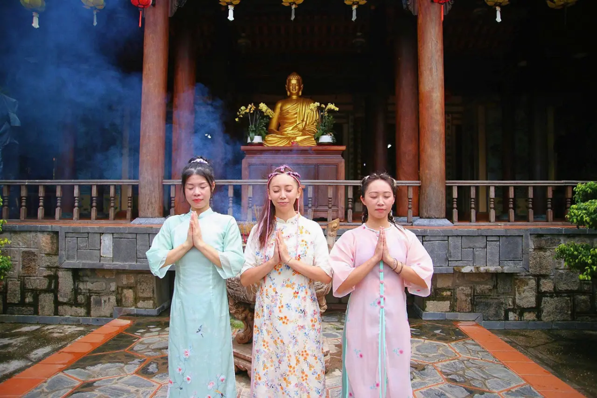 Những địa điểm văn hóa – lịch sử như Chùa Long Sơn, Tháp Bà Ponagar hay Nhà Thờ Núi trở thành phông nền lý tưởng, tôn lên nét mềm mại của Áo Dài trong từng bức ảnh. Sự hòa quyện giữa kiến trúc cổ kính và trang phục truyền thống giúp mỗi tấm hình đều mang giá trị thẩm mỹ và chiều sâu văn hóa.